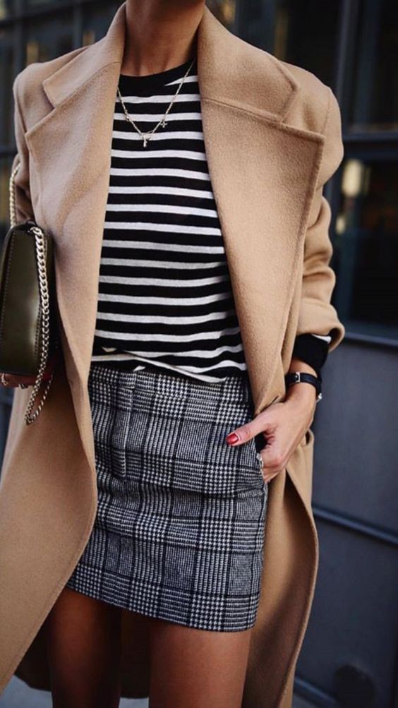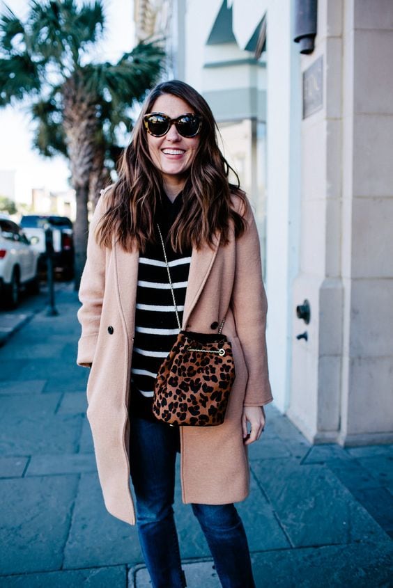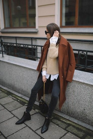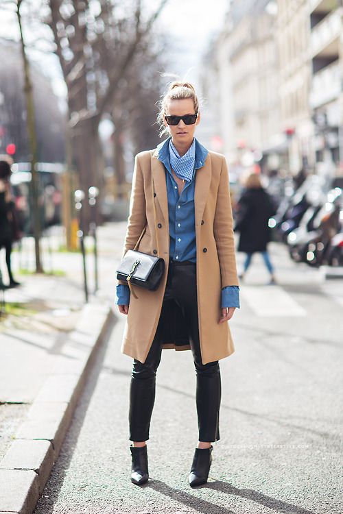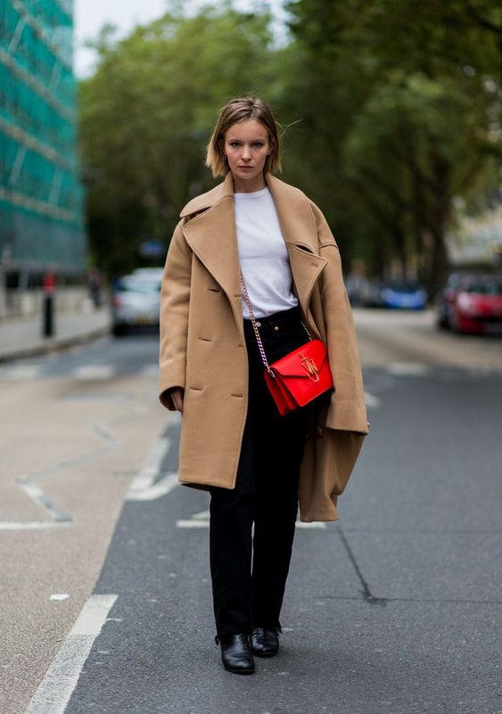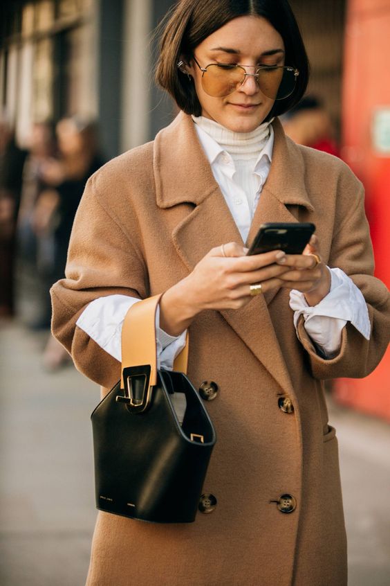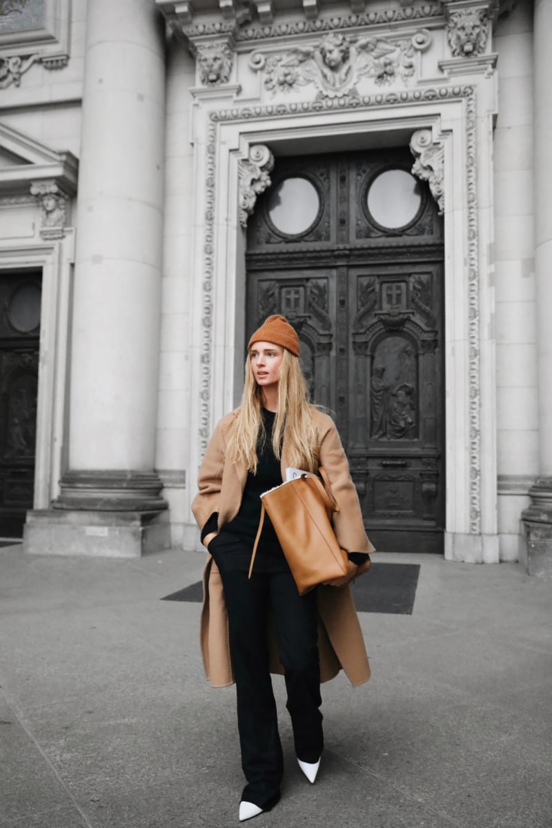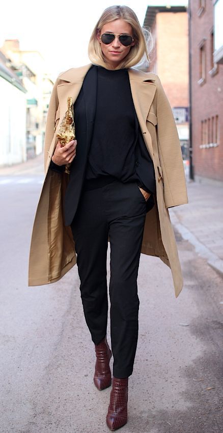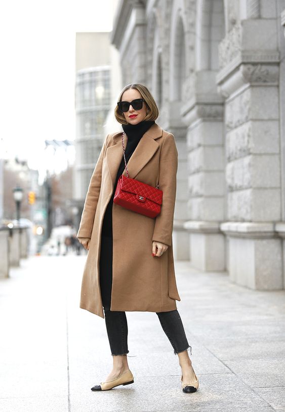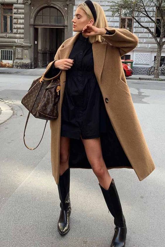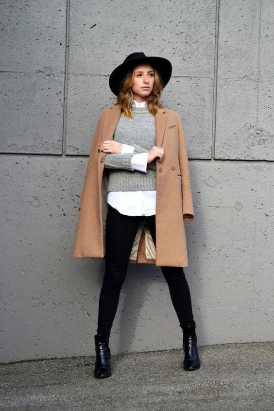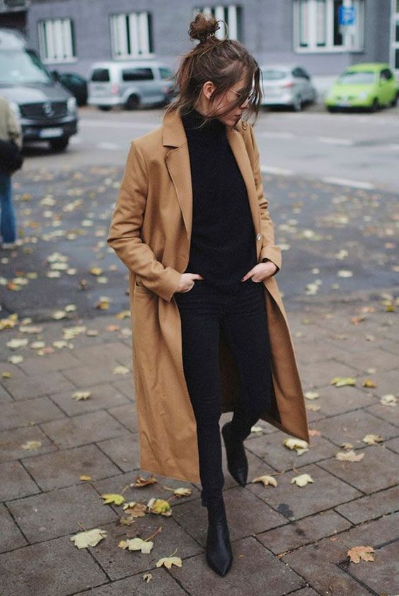 L’une des façon la plus simple (et très chic !) de porter un manteau camel est de l’associer à un total look noir. Avec une petite robe noire, des bottes et des collants, ou un jean noir, ou un pantalon smart… vous ne pourrez pas vous tromper ! Personnellement je trouve que le total look noir est particulièrement joli avec une touche de cuir, comme une jupe en cuir ou un pantalon en cuir. En haut, un petit pull en cachemire noir ou à col roulé en laine mérinos sera magnifique sous votre manteau camel. Si vous trouvez que votre tenue toute noire manque de lumière, n’hésitez pas à ajouter une petite touche dorée avec une ceinture fine, ou des bijoux dorés.