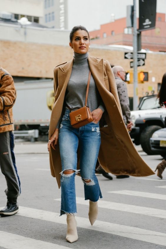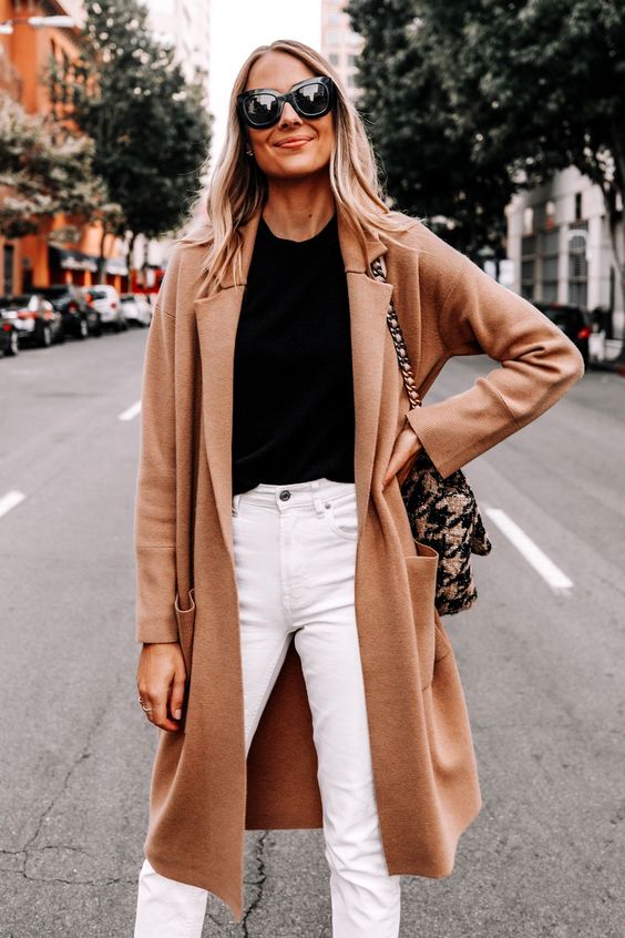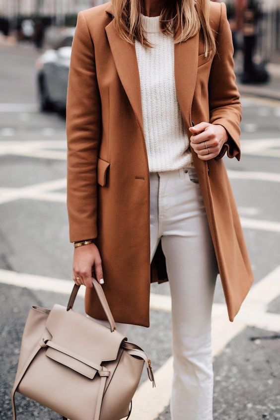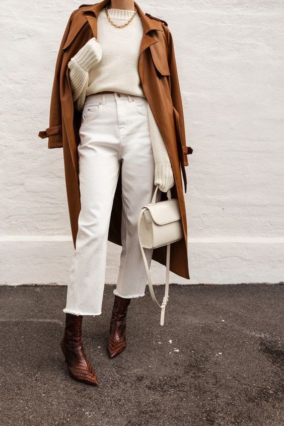 Je ne vais pas (encore !) me répéter sur les avantages du jean blanc ou beige en hiver, je pense que vous allez m’en vouloir^^Mais… il n’empêche qu’il est hyper beau lorsqu’il est associé à un manteau camel. Vous pouvez d’ailleurs optez pour le total look blanc avec un pull écru ou crème, mais avec un pull noir et des boots noires ça marche bien aussi. Si vous avez un doute je vous invite à (re)lire mon article « comment porter un jean blanc en hiver avec du foncé ».