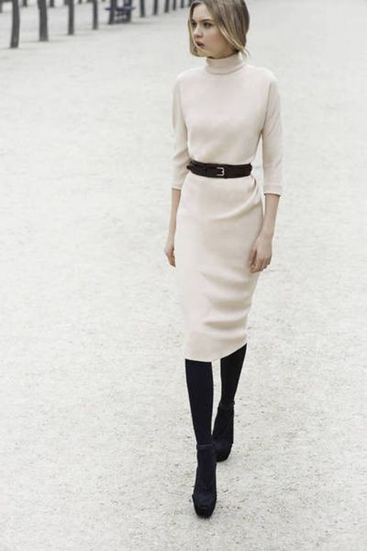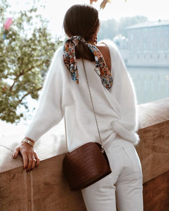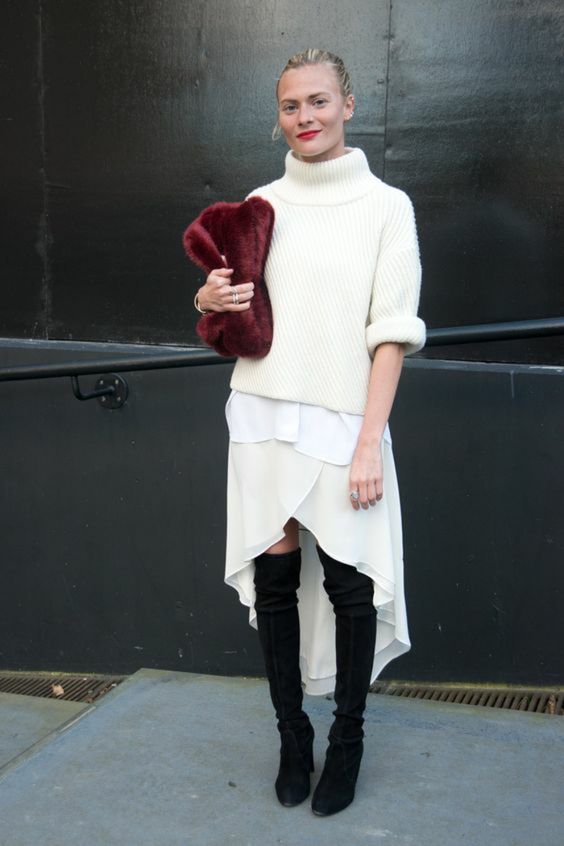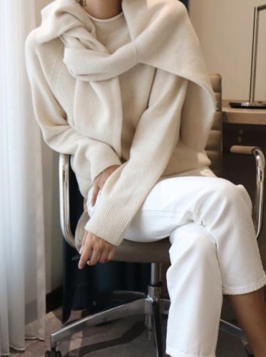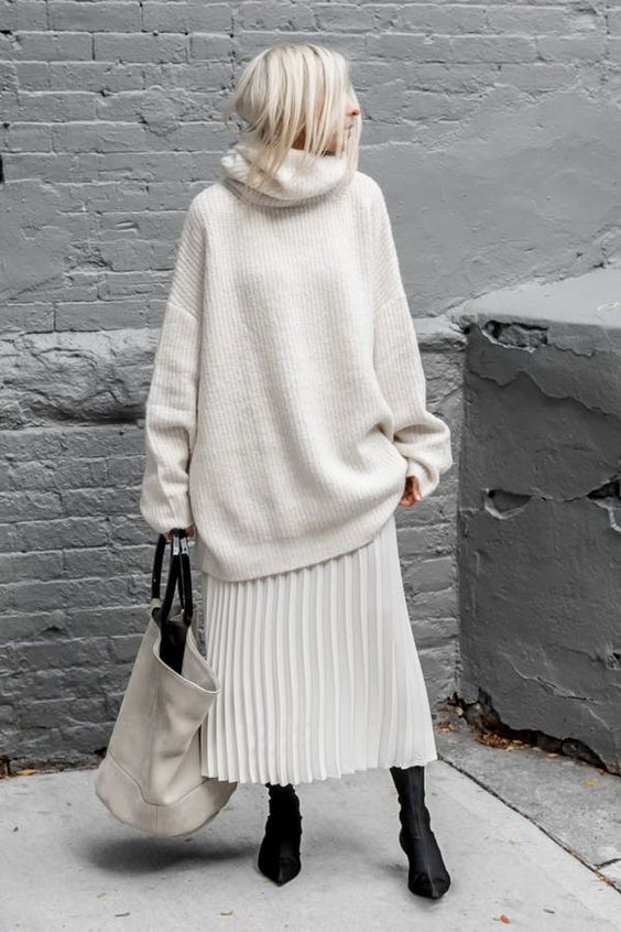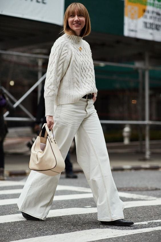 - On mélange les coupes et les matières (jean blanc + gros pull en laine à torsades ou jupe fluide en soie + pull à col roulé par ex)